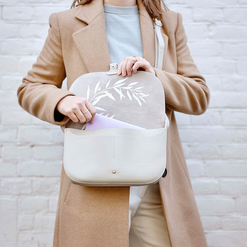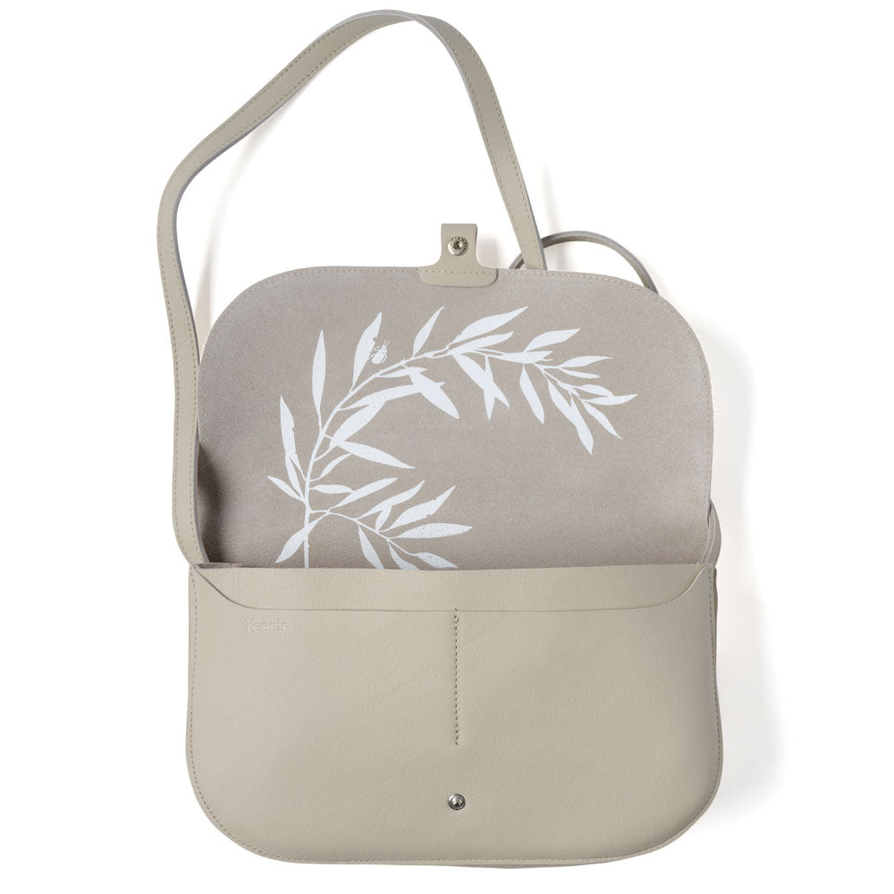 Wie bei jeder Keecie werden Sie beim Öffnen der Tasche von einem handgefertigten Siebdruck überrascht. Diesmal mit einem Olivenzweig. Das Symbol des Friedens und der Hoffnung.