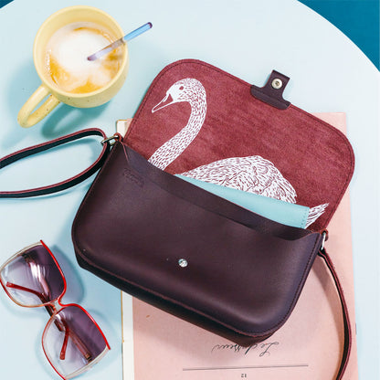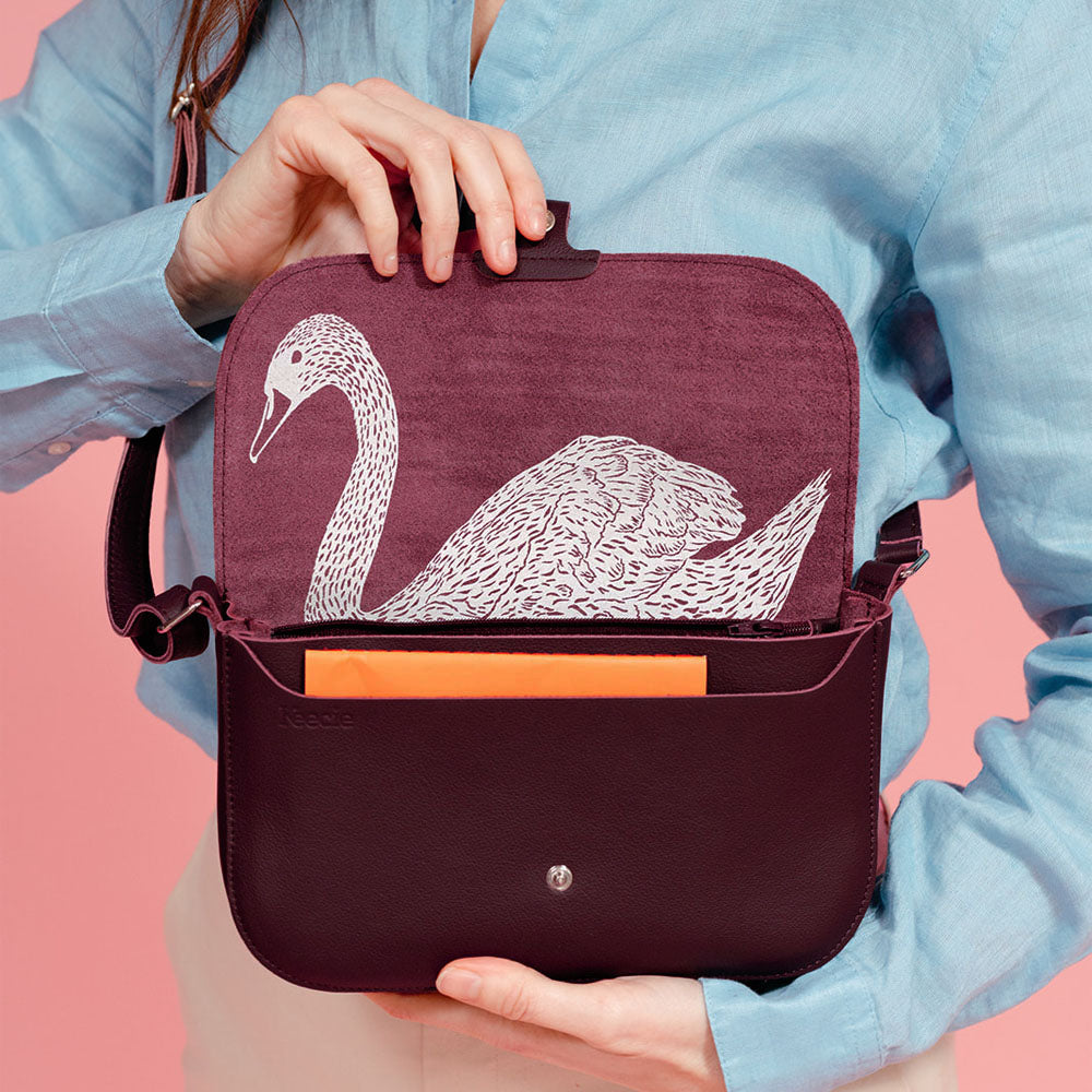 Wild Swan ist eine mittelgroße Crossbody-Handtasche, die praktischen Nutzen mit stilvollem Aussehen kombiniert. Diese Damentasche begleitet Sie durch den Alltag, zu abendlichen Veranstaltungen und zu entspannten Tagestrips. Im Inneren finden Sie einen einzigartigen Keecie-Print mit einem Schwan, der zu Ihrem stillen Begleiter wird.