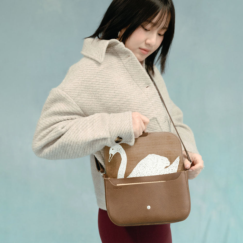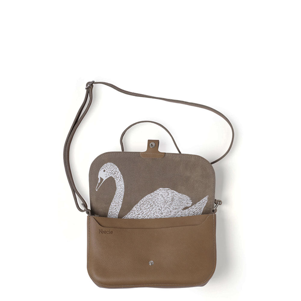 Wild Swan ist eine mittelgroße Crossbody-Handtasche, die praktischen Nutzen mit stilvollem Aussehen kombiniert. Diese Damentasche begleitet Sie durch den Alltag, zu abendlichen Veranstaltungen und zu entspannten Tagestrips. Im Inneren finden Sie einen einzigartigen Keecie-Print mit einem Schwan, der zu Ihrem stillen Begleiter wird.