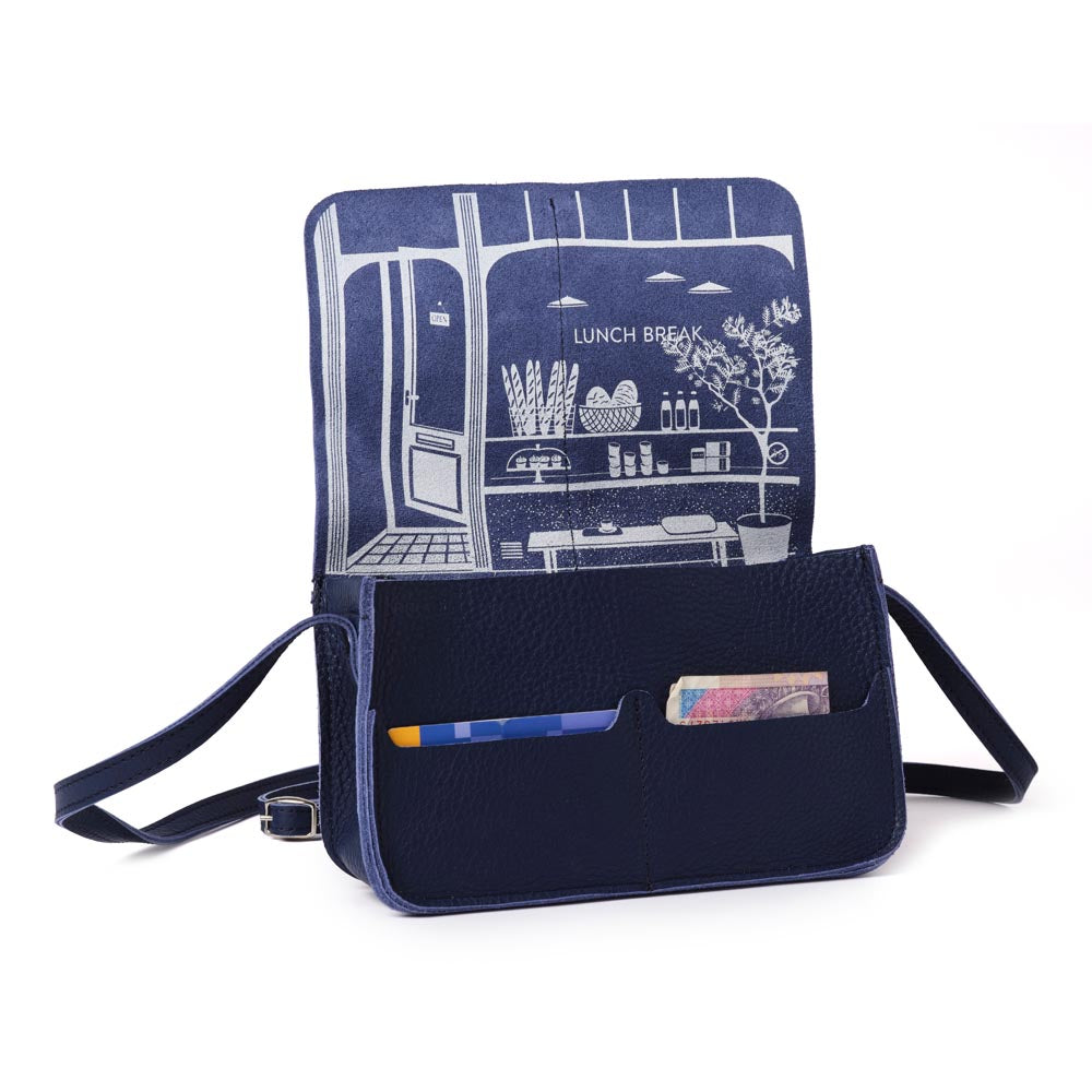 Lunch Break ist die Ledertasche für Ihre schönste Zeit des Tages. Eine praktische Tasche für Damen in der Größe einer Lunchbox mit einem Siebdruck auf der Innenseite, der den hübschen kleinen Lunchroom um die Ecke zeigt. Und so kompakt die...